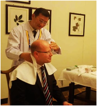 捷克总理索博特卡表示对中医很感兴趣,在现场体验区,不仅参观了解了中国中医传统文化,还亲身体验了神奇的中医推拿。来自上海中医药大学针推学院的中经堂特聘专家李征宇教授,利用中医一指禅推法,结合中经堂特色颈肩专项调理的思路,为索博特卡展示了颈部推拿。